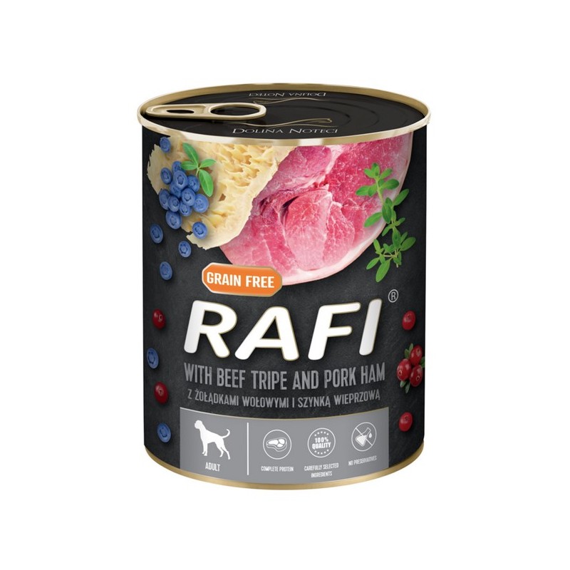 RAFI Z ŻOŁĄDKAMI WOŁOWYMI SZYNKĄ BORÓWKĄ MOKRA KARMA DLA PSÓW 500 G